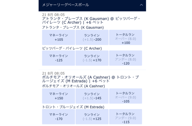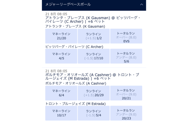 ブックメーカーの野球でベットできるオッズ