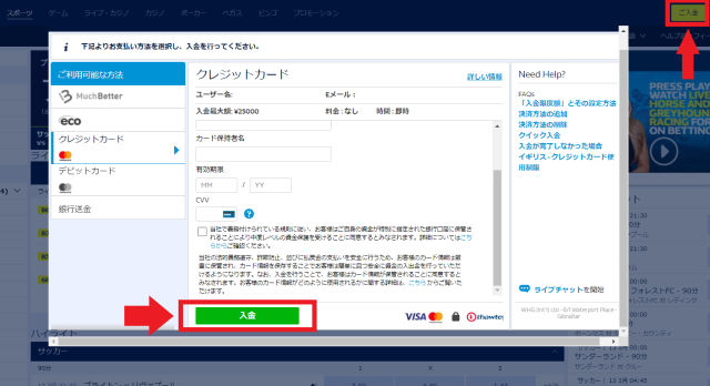 ウィリアムヒルカジノの公式サイトで登録し、ログインすると、画面右上に『ご入金』ボタンが出てくるので、そこから入金しましょう。