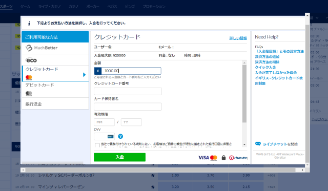 次に、ブックメーカーのプレイヤーアカウントに入金します。ウィリアムヒルカジノにログインすると画面右上に『ご入金』のボタンが表示されるのでクリックしてください。