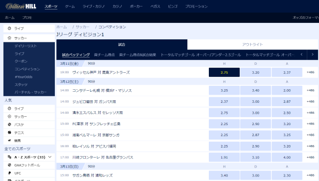 ![]() ウィリアム | ・200種類以上のJリーグオッズを取り扱う ・老舗で安全性の高いブックメーカー ・スポーツベットで使用可能なボーナス有り |