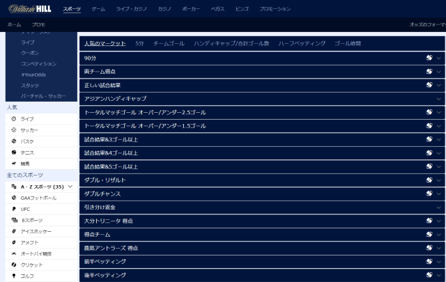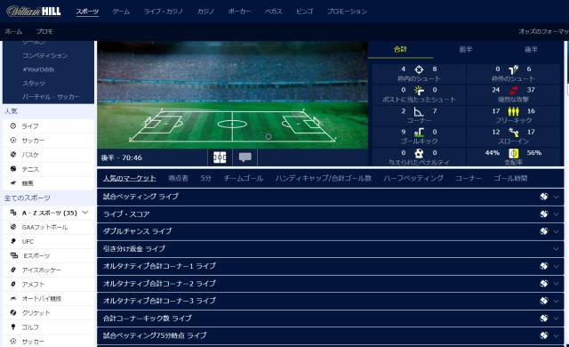 ウィリアムヒルカジノでは、下記のようにリアルタイムで変化する試合情報を閲覧しながらオッズを選べます。