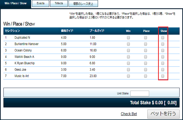 気をつけたいのはこの「Each Way」を選択すると、賭け金の入力欄に打ち込んだ数字の2倍の額、例えば100ドルと打ち込めば実質200ドル賭けることになるということです。
