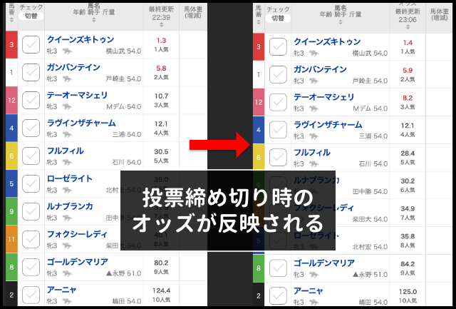 オッズは常に変動するため、表示されているオッズが投票締め切りまで同じ数値であることはほぼありません。予想が固いオッズに高倍率がついている場合は狙い目ですので、是非見つけてみてください。