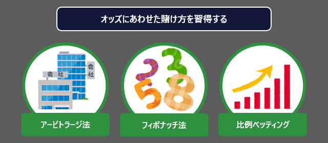 オッズを厳選できるようになったら、次は賭け方のアレンジにチャレンジしてみましょう。最初のうちは定額ベットでもかまいませんが、オッズに合う賭け方を習得すれば、トータル利益プラスをより達成しやすくなります。