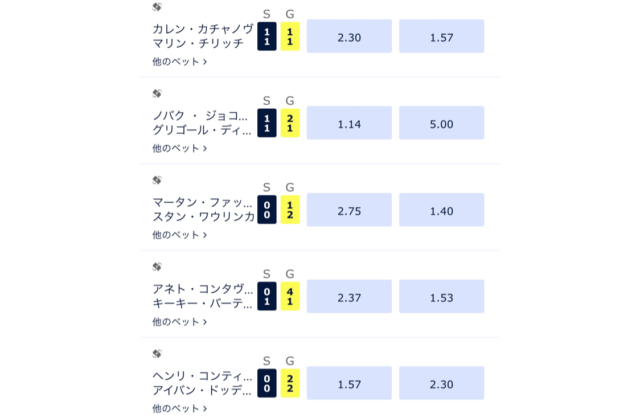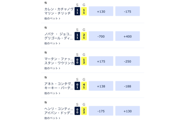その他にも「指定した選手がセットを落とさずにトーナメントで優勝できるか」「指定した選手が世界ランキング1位になれるか」といったユニークなものもあります。