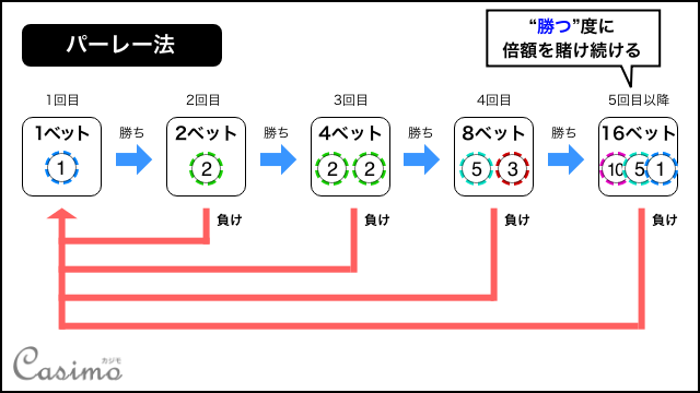 「マーチンゲール法」とは逆に、ゲームで勝った時に賭け金を倍に増やしていく方法が「パーレー法」です。要は、勝った金額をそのまま次のベットにつぎ込もうということです。