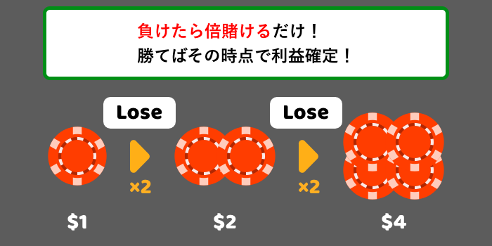 マーチンゲール法は、負けたら次ゲームで前ゲーム賭け金の倍額を賭ける手法です。必勝法の中で最も有名で、かつ、即戦力になる手法です。