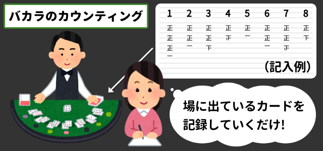 バカラの必勝法2つ目はカウンティングです。カウンティングとは、場に出たカードをメモしながら、次に場に出るカードを予測する方法です。