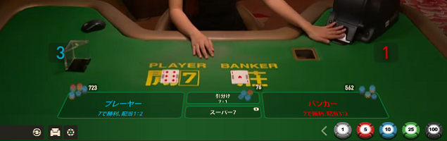 - スーパー6バカラの流れ(チップを置いてから勝敗が決まるまで)