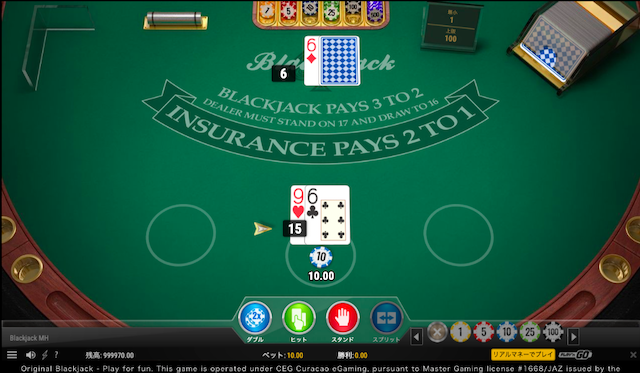 プレイヤーのカード合計が「15」、ディーラーのアップカードが「6」です。