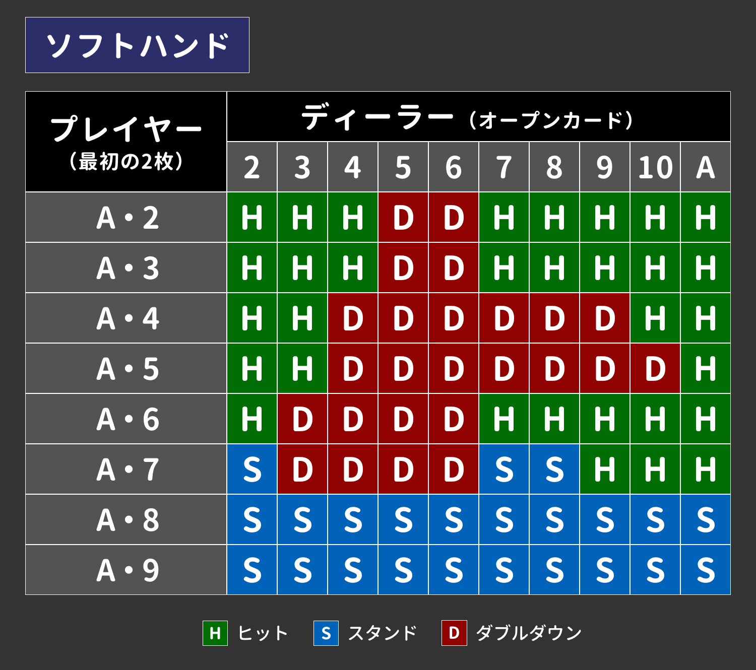 ソフトハンドは、配られたカードに「A」が含まれている場合に使用します。