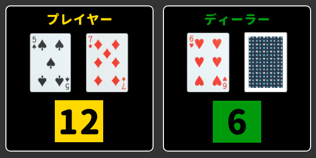 プレイヤーに「5」「7」の2枚が配られ合計が「12」、ディーラーのアップカードが「6」であったとしましょう。