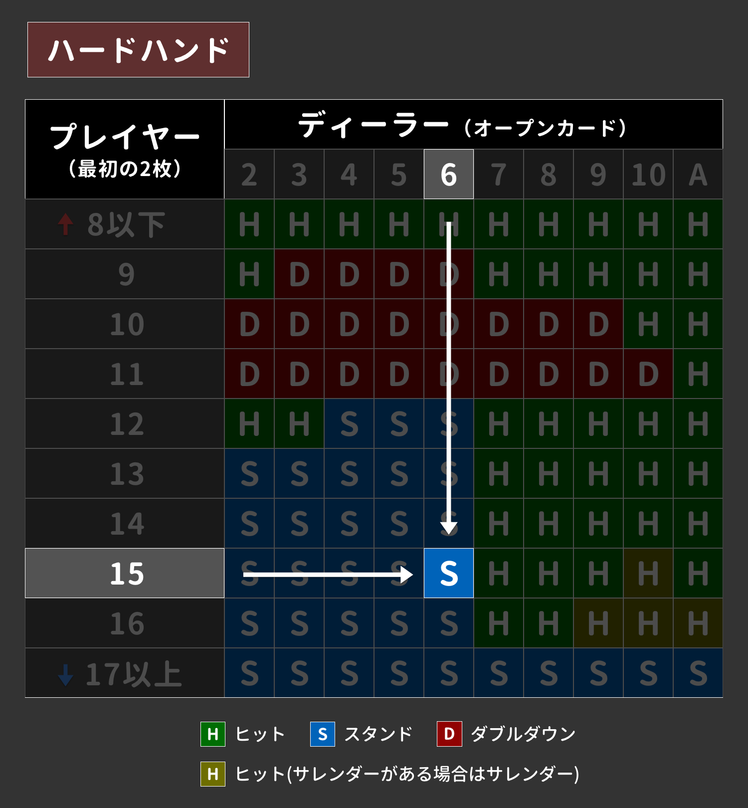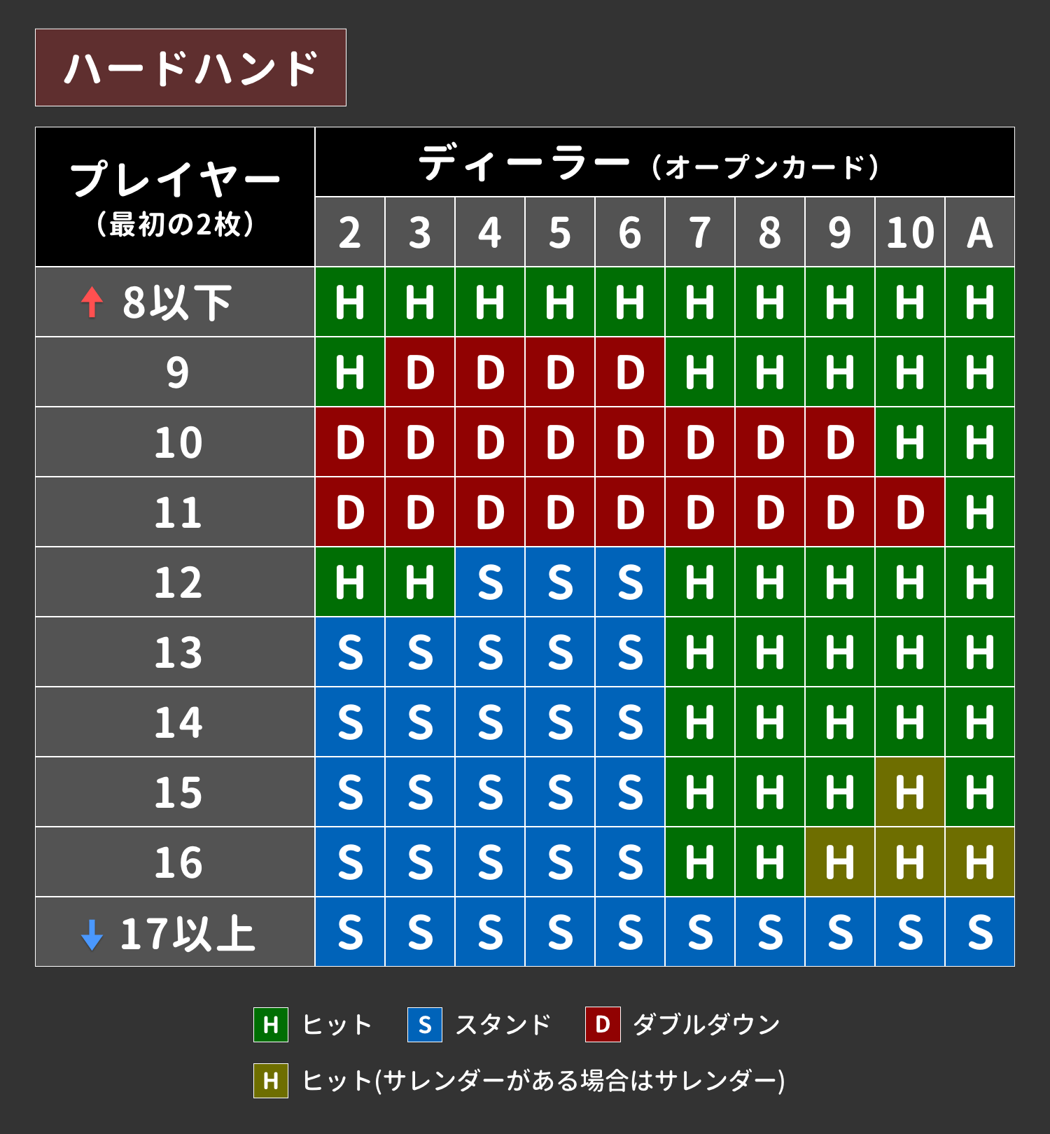 ハードハンドは、冒頭に紹介したベーシックストラテジーの表を使用します。