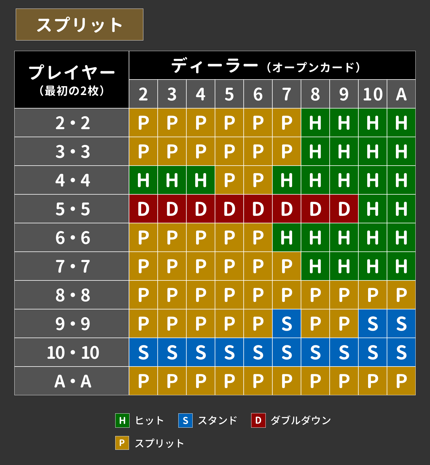 上記の数字をスプリット表に照らし合わせると、次のアクションが「P:スプリット」と示されていました。