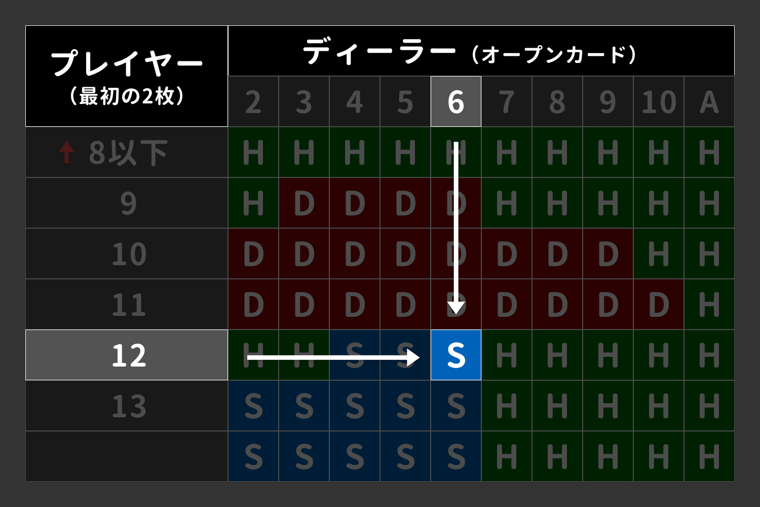 プレイヤーカードの合計数「12」とディーラーのアップカード数「6」をベーシックストラテジーの表で照らし合わせると、交点には「S:スタンド」が示されています。