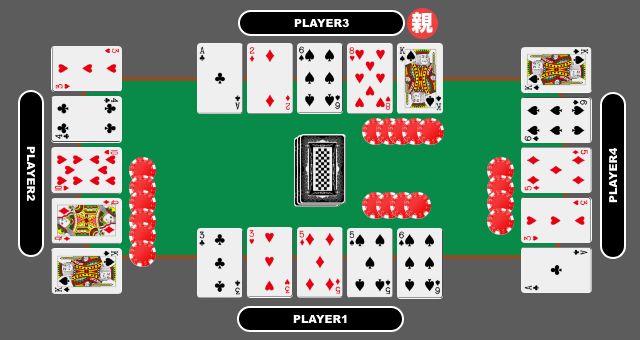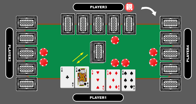 親の左側の人から、手札の中で不要なカードがある場合はそのカードを場に伏せて出し、新しいカードを親からもらってください。