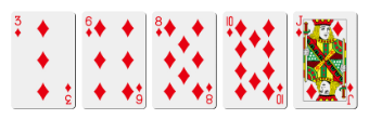 ![]() | 【ストレートフラッシュ】 ストレートとフラッシュが同時に完成する。数字に指定はありません。 | 0.00139% |