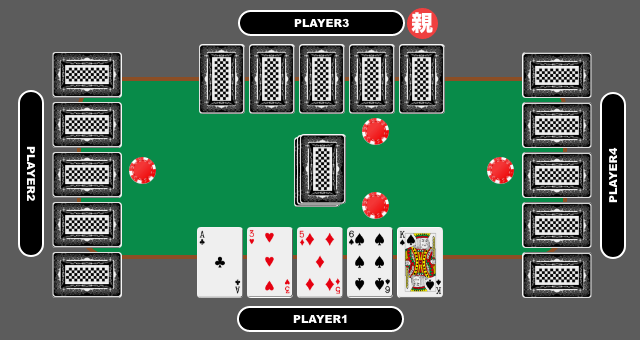 一般的なポーカーでは、参加者全員に5枚のカードを配り、5枚のカードで作られる役の強さによって勝敗を決めます。