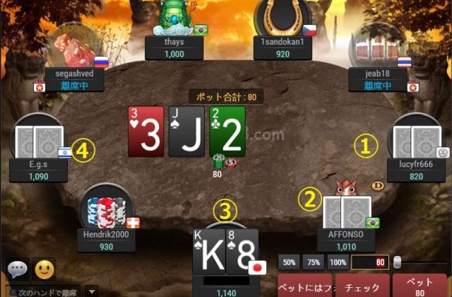 $80ベットに対し、④はコールして、①②はフォールドしました。