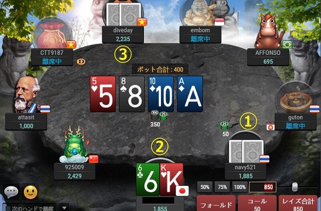 ①が$50をベットしましたが、プレイヤーは①より大きく賭けることで①③に「強いハンドを持っている」と思い込ませてフォールドさせたいと思います。