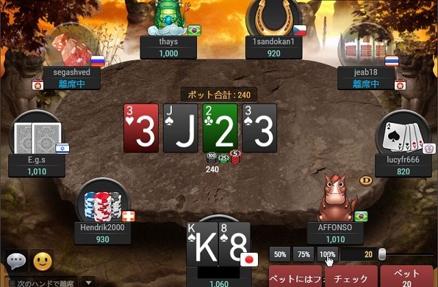 また、そのような状況でブラフを仕掛けるとかなり強いレイズアクションをしなければ不自然です。怖気づいて少額しかレイズしなければ不自然なアクションに見え、即バレに繋がります。