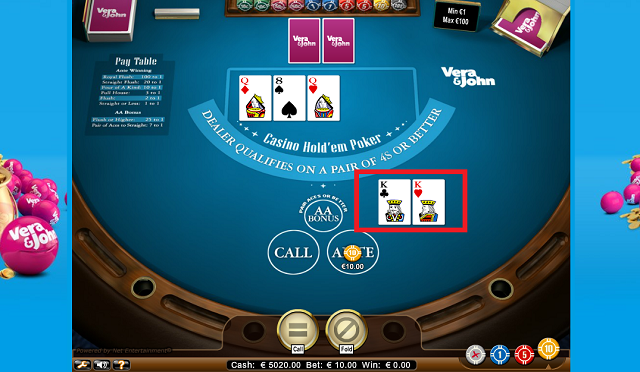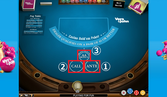 下の画像はベラジョンカジノの「Casino Hold’em」で、最高ベット金額は$100です。