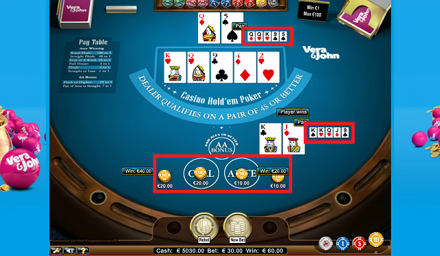 カジノホールデムは他のポーカーよりも勝ちやすいゲームですので、基本的にはAA BONUSには賭けず、「役を揃えられるかどうか」に徹しましょう!
