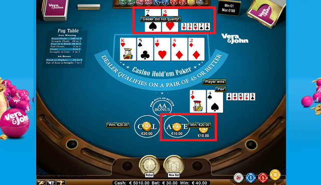 ディーラーは「4」のワンペア以上の役が揃わないと勝負ができず、たとえ自分の役がディーラーより弱くても「Not Qualify(ノットクオリファイ)」と言って、自動的にプレイヤーの勝利になります。 賭け方や配当についてはこの後詳しく説明しますが、この場合は、「Ante(アンティ)」に賭けた金額と同額の配当を獲得します。