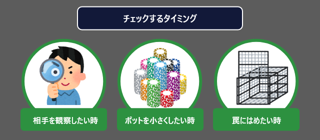 ポーカーのチェックがどういうアクションか理解したところで、使うタイミングを以下の場面・状況に分けて解説していきたいと思います。