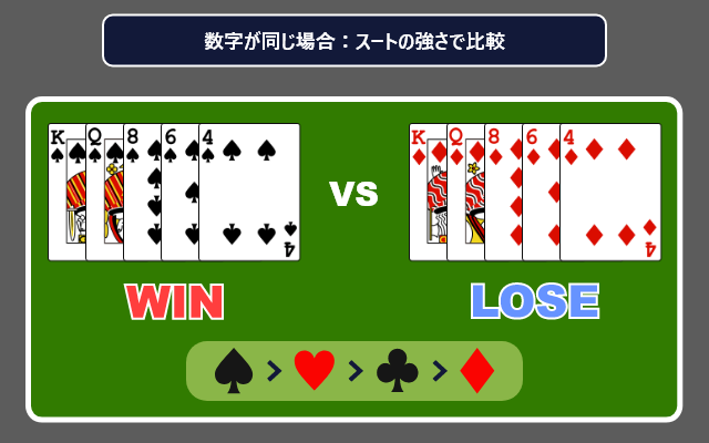 構成する数字がまったく同じ場合は、スートの強さで比較して勝敗を決めます。