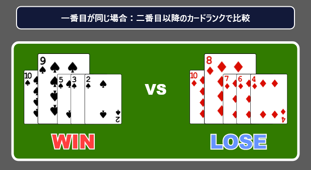 一番ランクの高いカードが同じ場合、二番目以降のカードで数字比較して勝敗を決めます。
