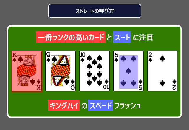 たとえば、スペードのK-Q-10-5-2で構成されるフラッシュは「キング(K)ハイのスペードフラッシュ」といいます。