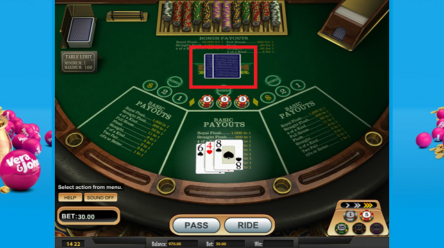 次にレットイットライドポーカーの具体的な遊び方について、ベラジョンカジノで遊べる「Ridem Poker」の画像を引用しながら詳しく解説していきます。