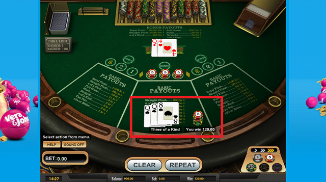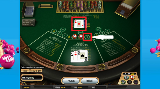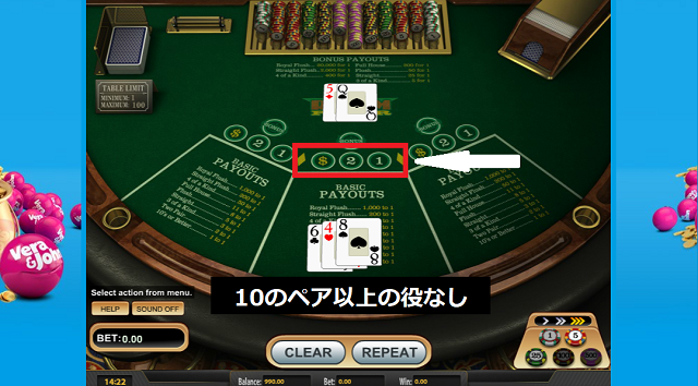 配当はカジノやテーブルによって異なりますので、今回はベラジョンカジノで遊べる「Ridem Poker」を例に出して紹介したいと思います。