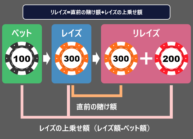 たとえば、あるプレイヤーが$100ベットし、次のプレイヤーが$300までレイズしたとしましょう。この時、リレイズするためには$500(直前のベット額+レイズ上乗せ分)を出す必要があります。