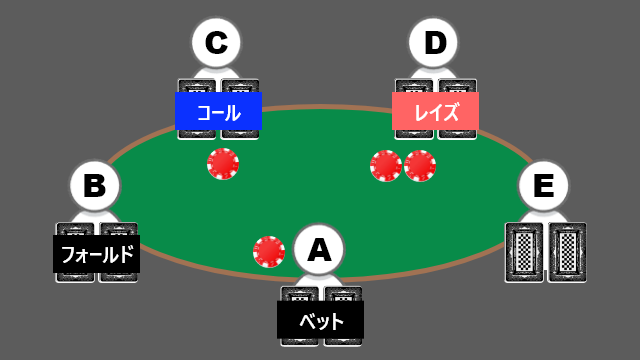 この後レイズしたプレイヤーD以外全員がフォールドすればDの勝ちです。コールかレイズされた場合はゲーム続行となります。