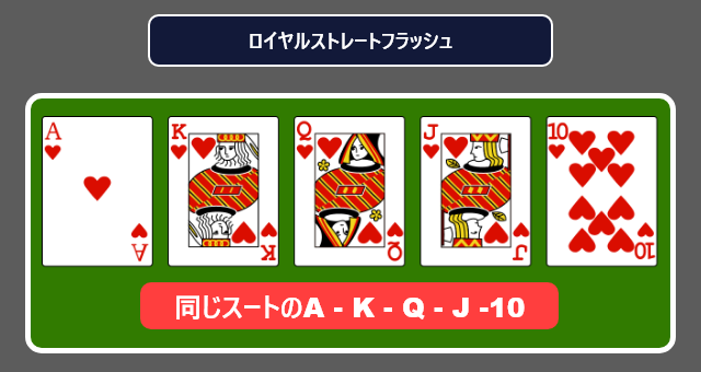 ロイヤルストレートフラッシュとは「同じスート(マーク)の10-J-Q-K-Aで構成される役」です。