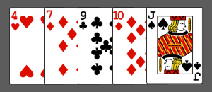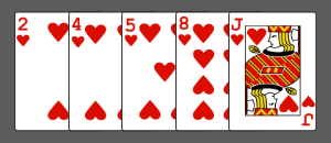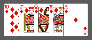 10JQKA+同じスート=「ロイヤルストレートフラッシュ」です。海外のカジノではロイヤルフラッシュと呼ばれています。