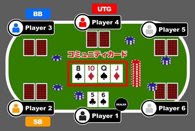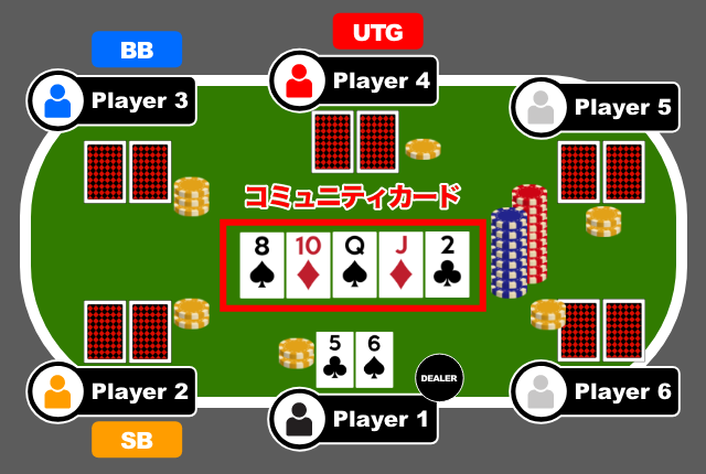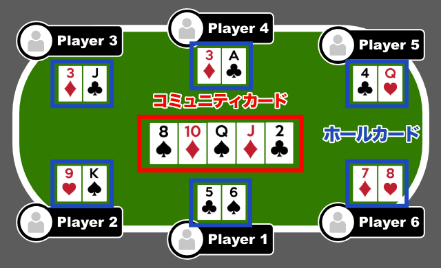 このカードを共通カード(コミュニティカード)と呼び、各々コミュニティカードと手持ちのカードを見て、アクションを決定します。