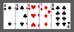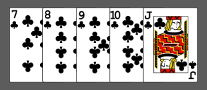 連続する5枚の数字で構成する役で作る役は「ストレート」です。ストレート同士の勝敗は、5枚の中で一番強い数字を比べて決めます。