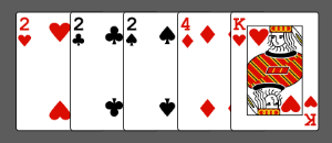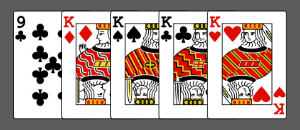 同じ数字3枚+バラバラの2つの数字で作る役は「スリーカード」です。海外では「スリー・オブ・ア・カインド」と呼ばれます。