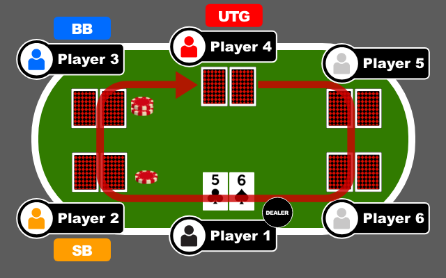 プリフロップの最初のアクションを行うのは、時計回りでBBに一番近い人です。(BBの隣の人をUTGとも呼びます。)