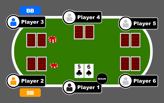 ディーラーボタンが置かれたプレイヤーの横にいる1人目をSB(スモールブラインド)と呼び、2人目をビックブラインドBB(ビックブラインド)と呼びます。