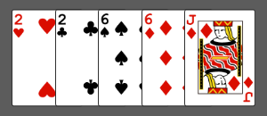 同じ数字のペア2組み+それ以外の数字で作る役は「ツーペア」です。