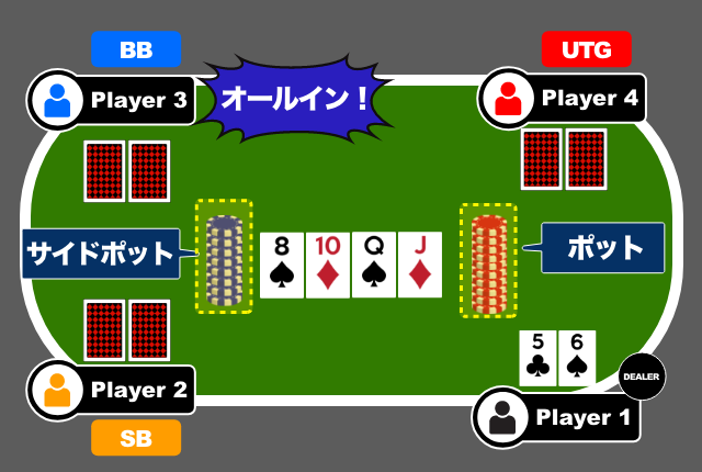 このような結果を防ぐため、誰かがオールインを行うと、それまでにチップを集めたポット(メインポット)とは別のポット「サイドポット」がつくられ、それ以後にベットされたチップはすべてサイドポットに集められます。
