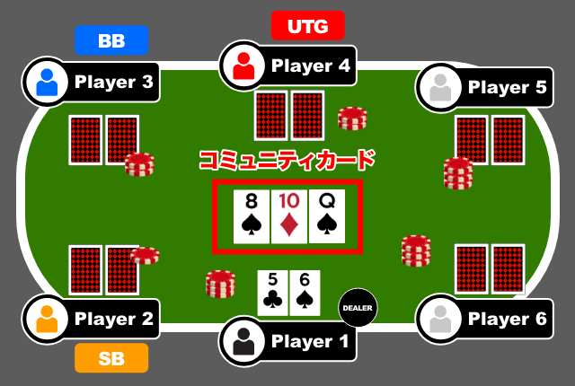 第2ラウンドである「フロップ」に進むと、ここではじめてディーラーによってコミュニティーゾーンにある3枚のカードがオープンされます。