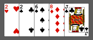 数字もマークもすべてバラバラな状態(俗にいう「ブタ」)の役は「ハイカード」です。ハイカード同士の勝敗は、2枚目にカードの強さで決めます。