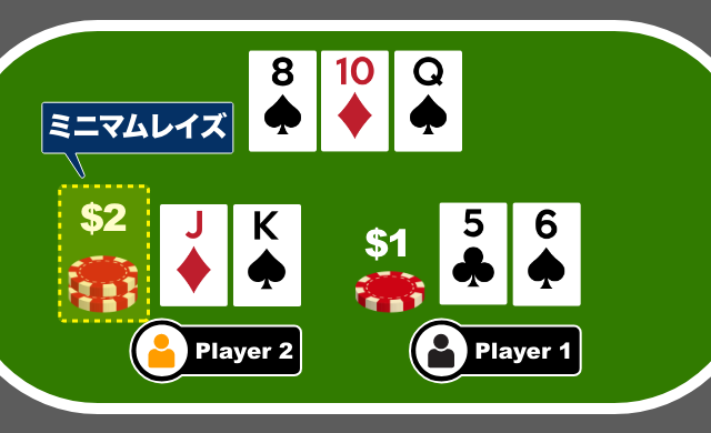 レイズする場合、「ほんのわずかな上乗せ金額でもOK」としてしまうと、ちびちびと少額のレイズを続ければ時間稼ぎできてしまい、ゲームがまともに進行できなくなります。
