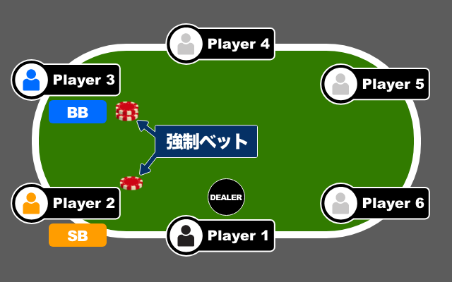 SBとBBはカードが配られる前に強制ベット(ブラインド)しなければいけません。ブラインドが必要な理由はゲームの参加を促し、ベットしないプレイヤーを減らすためです。