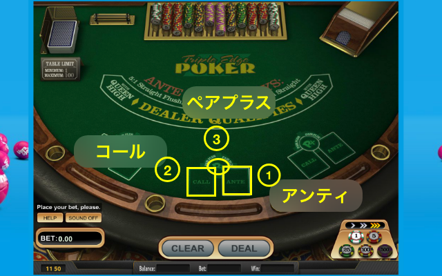 それでは早速、スリーカードポーカーの流れを見ていきましょう。